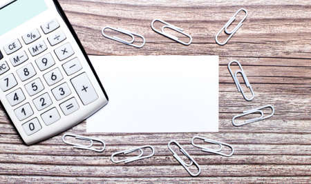 On a wooden background, a white calculator, white paper clips and a white blank card for inserting text. Top view with copy space. Template
