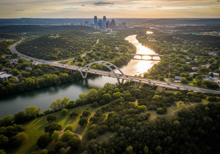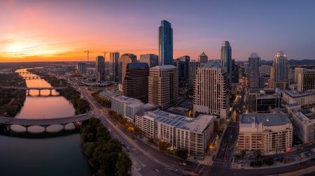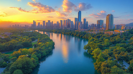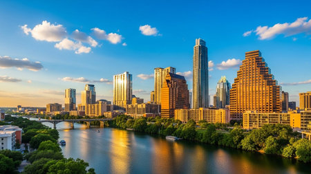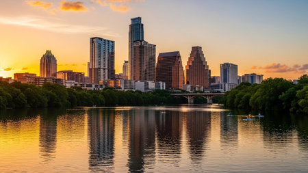 The vibrant Austin, Texas skyline is captured at sunset, bathed in the warm glow of golden hour. The Colorado River flows gracefully through the scene, reflecting the colorful sky and the modern architecture of the city's skyscrapers. Lush green trees line the riverbanks, adding a touch of nature to the urban landscape. Clouds dot the clear blue sky, enhancing the picturesque panorama of this dynamic cityscape.