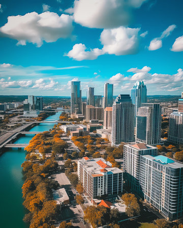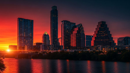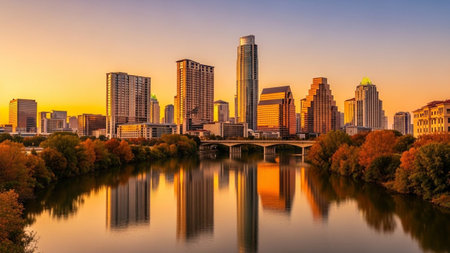 A panoramic view of the Austin, Texas skyline at sunset. Tall modern skyscrapers rise majestically against a vibrant orange and yellow sky. The Colorado River flows calmly in the foreground, perfectly mirroring the city's illuminated buildings and the warm hues of the setting sun. Lush autumn trees with vibrant red and orange leaves line the riverbanks, adding a touch of natural beauty to the urban landscape. A bridge spans the river, connecting the city. The scene is bathed in the soft,...