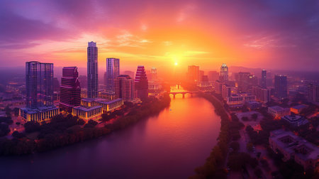 The Austin skyline is dramatically illuminated against a vibrant twilight sky painted with deep purples and fiery oranges. Tall modern skyscrapers rise above the cityscape, their windows glowing with artificial light. A wide river flows in the foreground, its surface mirroring the colorful sky and the city's lights, creating a visual reflection. A bridge spans the water, further connecting the urban landscape. The scene captures the serene beauty of the city at dusk, showcasing its dynamic...