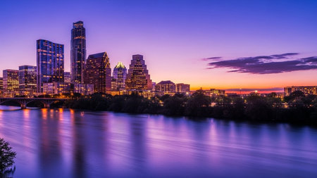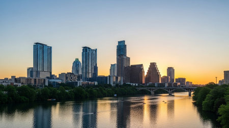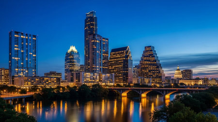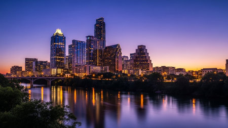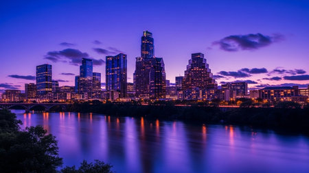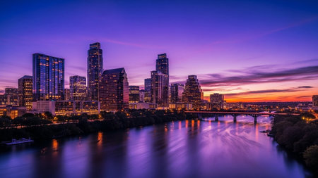 The vibrant Austin, Texas skyline is captured at dusk, with the sky awash in a gradient of deep blues, purples, and oranges. The city's modern skyscrapers are illuminated, their lights reflecting beautifully on the calm surface of the Colorado River in the foreground. A bridge spans the water, connecting parts of the city. Lush green trees line the riverbanks, creating a natural contrast to the urban architecture. The overall scene is serene and picturesque, showcasing the beauty of the city...