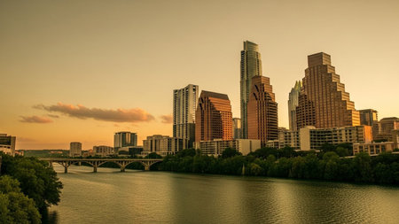 The Austin, Texas skyline is captured in the warm, soft light of sunset. Tall, modern skyscrapers rise above a lush green treeline, with their golden facades reflecting the fading sunlight. The Colorado River flows gently in the foreground, its surface mirroring the cityscape and the sky. A bridge spans the river, connecting the urban center to the surrounding landscape. The overall scene is serene and picturesque, showcasing the blend of urban development and natural beauty.