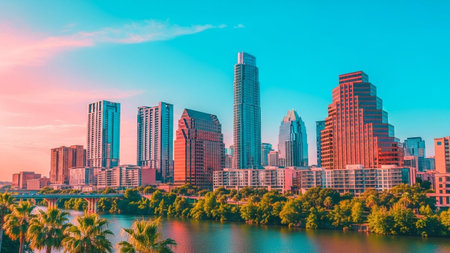 A panoramic view of the Austin, Texas skyline at sunset. The sky is a vibrant gradient of pink and blue, with soft clouds reflecting the warm hues of the setting sun. Tall modern skyscrapers dominate the cityscape, their windows catching the light. A calm river flows in the foreground, mirroring the colorful sky and the urban landscape. Lush green trees and palm trees line the riverbanks, adding a touch of nature to the urban scene. A bridge is visible in the distance, connecting parts of...