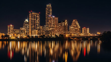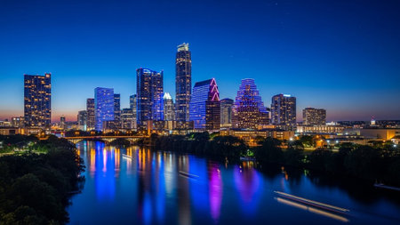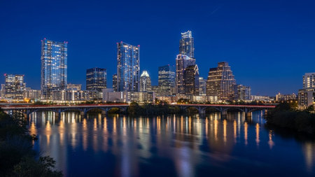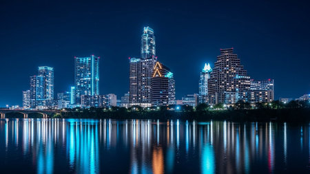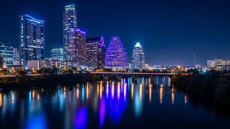 A vibrant nighttime cityscape of Austin, Texas, showcases a collection of modern skyscrapers illuminated with colorful lights, primarily blue and purple. The city skyline is reflected in the dark, still waters of a river that flows through the foreground. A bridge spans the river, with its lights also contributing to the overall illumination. The sky is a deep, dark blue, creating a dramatic contrast with the bright urban lights. Trees line the riverbanks, adding a touch of nature to the...