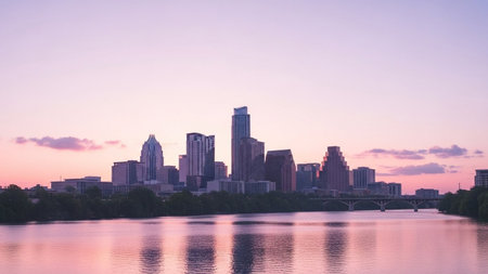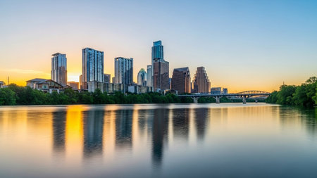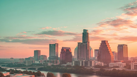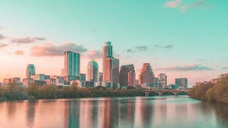 The vibrant Austin, Texas skyline is captured at sunset, with a serene river flowing in the foreground. Tall skyscrapers and modern buildings are reflected in the calm water, creating a mirrored effect. The sky is a gradient of pastel colors, transitioning from soft pinks and oranges near the horizon to a calming teal overhead. The city lights begin to twinkle, adding to the picturesque urban landscape. conveys a sense of tranquility and the beauty of a metropolitan sunset.