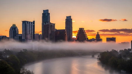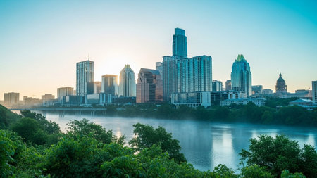 The Austin, Texas skyline is captured at sunrise, bathed in the soft, warm light of dawn. Tall skyscrapers and modern buildings form a distinct urban silhouette against a clear, pale blue sky. A gentle mist hovers over the calm river in the foreground, reflecting the sky and city lights. Lush green trees and foliage line the riverbanks, adding a natural to the urban landscape. The scene conveys a sense of tranquility and the beginning of a new day in a vibrant city.