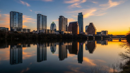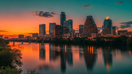 A view of the Austin, Texas skyline at sunset. The sky is a vibrant gradient of orange and teal, with scattered clouds. Tall modern skyscrapers dominate the city center, their lights beginning to twinkle. The calm water of the river or lake in the foreground perfectly reflects the city lights and the colorful sky, creating a symmetrical and visual. A bridge can be seen in the distance, adding depth to the urban landscape. The overall mood is serene and capturing the essence of a city at...