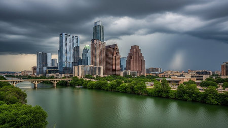 A dramatic view of the Austin, Texas skyline unfolds beneath a sky filled with dark, brooding storm clouds. A wide, green river flows in the foreground, reflecting the moody atmosphere. Tall modern skyscrapers dominate the cityscape, interspersed with lush green trees lining the riverbanks. A bridge spans the water, connecting parts of the city. The impending rain adds a sense of drama and intensity to the urban landscape, creating a striking contrast between the natural and the man-made...