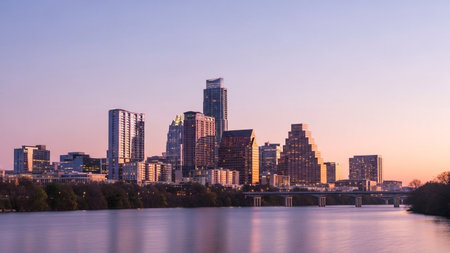 A panoramic view of the Austin, Texas skyline at sunset. The city's modern skyscrapers are silhouetted against a soft purple and pink sky. A calm river flows in the foreground, reflecting the colors of the twilight. Trees line the riverbank, adding a touch of nature to the urban landscape. The overall mood is serene and peaceful, capturing the beauty of the city at dusk.