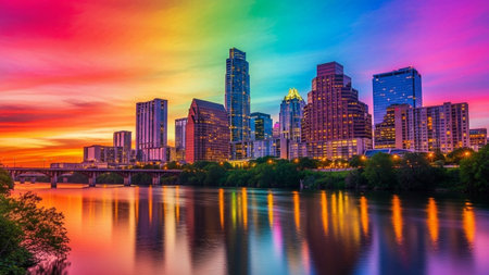The Austin, Texas skyline is dramatically illuminated against a sunset sky painted with vibrant rainbow hues of orange, pink, purple, blue, and yellow. Tall skyscrapers and modern buildings form the city's silhouette, their windows glowing with interior lights. The Colorado River flows in the foreground, perfectly mirroring the colorful sky and the city's lights, creating a reflection. Trees line the riverbank, adding a touch of nature to the urban panorama. The scene captures the dynamic...