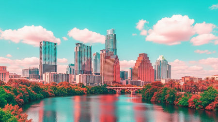 A panoramic view of the Austin, Texas skyline is captured with a vibrant and surreal color palette. The city's modern skyscrapers rise majestically against a bright teal sky dotted with soft pink clouds. A wide, reflective river flows in the foreground, mirroring the colorful buildings and the lush green and autumn-toned trees that line its banks. A graceful bridge spans the water, connecting the urban landscape with the natural beauty. The overall scene is bright, serene, and visually...