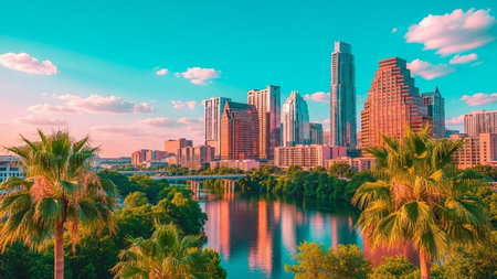 A vibrant cityscape of Austin, Texas, bathed in the warm hues of sunset. Tall modern skyscrapers dominate the horizon, reflecting the colorful sky. A tranquil river flows in the foreground, bordered by lush trees and iconic palm trees. The sky transitions from a soft orange and pink near the horizon to a bright turquoise overhead, creating a serene and picturesque urban landscape.