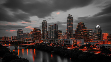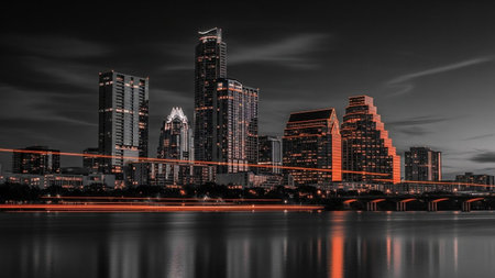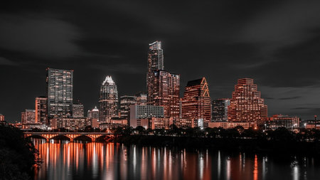 The Austin, Texas skyline is depicted at night, with a dramatic contrast between the dark sky and the warm, orange glow emanating from the illuminated buildings. The city's modern architecture stands tall against the darkness, their windows and architectural details highlighted. A body of water in the foreground reflects the city lights, adding depth and a sense of serenity. Streaks of orange light from traffic on bridges and roads suggest the city's constant activity.