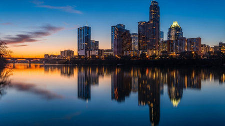 The Austin, Texas skyline is captured at dusk, with its modern skyscrapers illuminated by countless lights. The warm glow of the setting sun creates a contrast with the deepening blue of the twilight sky. The city's impressive architecture is mirrored perfectly in the calm waters below, creating a symmetrical reflection. A bridge can be seen in the distance, adding to the urban panorama. The scene conveys a sense of vibrant city life and architectural grandeur.