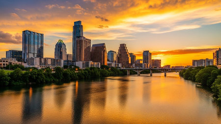 A panoramic view of the Austin, Texas skyline bathed in the warm, vibrant hues of a sunset. The sky is a canvas of orange and gold, with scattered clouds adding texture. The Colorado River flows serenely in the foreground, reflecting the city lights and the colorful sky. Lush green trees line the riverbanks, contrasting with the modern architecture of the skyscrapers that dominate the urban landscape. The scene evokes a sense of tranquility and the beauty of a city at dusk.