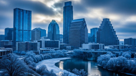 The Austin, Texas skyline is presented under a dramatic winter sky, with clouds casting a moody blue and grey light. The river in the foreground is partially frozen, and the surrounding trees are heavily frosted, creating a serene and cold atmosphere. Modern skyscrapers rise above the urban landscape, contrasting with the natural of ice and frost. The scene captures the unique beauty of a city experiencing winter conditions.
