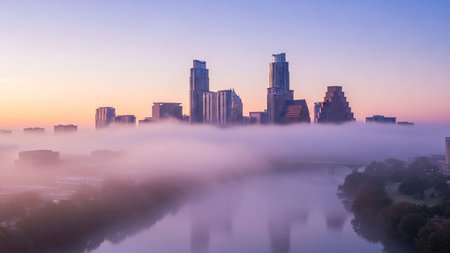 The Austin skyline is partially obscured by a thick blanket of morning fog that hovers over the Colorado River. Tall skyscrapers and modern buildings emerge from the mist, creating a dramatic and ethereal urban landscape. The soft hues of the sunrise paint the sky in shades of orange and yellow, reflecting subtly on the calm water below. This view captures a serene and atmospheric moment in the heart of the Texas capital.