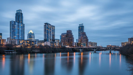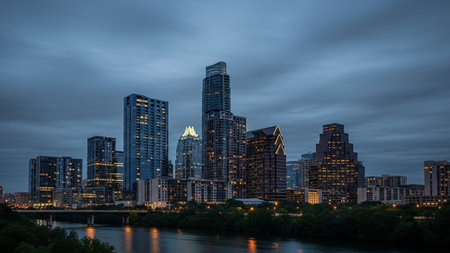 A panoramic view of the Austin, Texas skyline at dusk. Numerous modern skyscrapers with illuminated windows pierce the dark blue, cloudy sky. A calm river flows in the foreground, reflecting the city lights. Trees line the riverbank, creating a natural contrast to the urban landscape. A bridge spans the water, further enhancing the sense of depth and scale in this twilight cityscape.