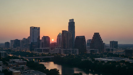 A panoramic view of the Austin, Texas skyline at sunset. The sky is a gradient of warm orange, pink, and yellow hues. Tall modern skyscrapers dominate the city center, with a river flowing in the foreground. City lights begin to twinkle as dusk settles, creating a serene and urban landscape. The scene captures the vibrant energy of the metropolis at the end of the day.