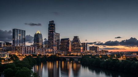 The vibrant Austin, Texas skyline is captured at dusk, with its modern skyscrapers illuminated against the darkening teal sky. The city lights create a spectacle, beautifully reflected in the calm waters of the river flowing in the foreground. Lush trees line the riverbanks, adding a touch of nature to the urban panorama. showcases the dynamic energy and beauty of the city at night.