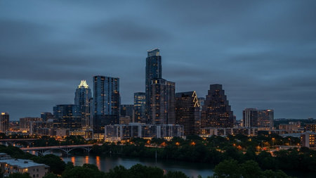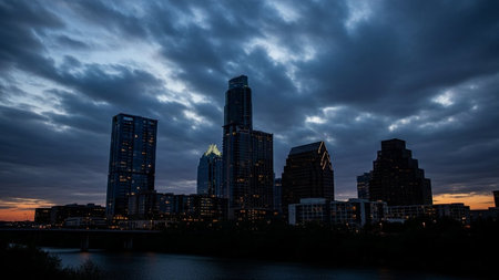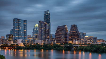 A panoramic view of the Austin, Texas skyline at dusk. Tall modern skyscrapers and buildings are illuminated against a dark blue, cloudy sky. A river flows in the foreground, with a bridge crossing it. Trees line the riverbanks, and city lights twinkle in the distance, creating a vibrant urban landscape. The scene captures the city's energy as day transitions into night.