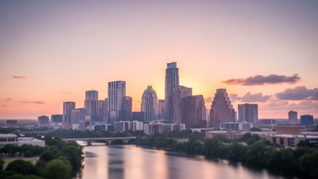 A panoramic view of the Austin, Texas skyline at sunrise. The sky is painted with soft hues of orange, pink, and purple, with scattered clouds. A calm river flows in the foreground, reflecting the city lights and the pastel sky. A bridge spans the river, connecting the urban landscape. Lush green trees line the riverbanks, contrasting with the modern skyscrapers that dominate the horizon. The overall mood is serene and peaceful, capturing the beauty of the city at the start of a new day.