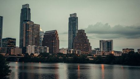 A panoramic view of the Austin, Texas skyline at dusk. Tall modern skyscrapers dominate the cityscape, their windows reflecting the fading light. A calm river flows in the foreground, mirroring the city lights and the overcast sky. Lush green trees line the riverbank, creating a natural contrast to the urban development. The overall mood is serene and slightly moody, capturing the transition from day to night in a bustling metropolitan area.