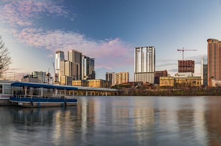 Downtown high-rises reflecting sunset golden hour light viewed across Lady Bird Lake or Town Lake on Colorado River in Austin, Texas, USA