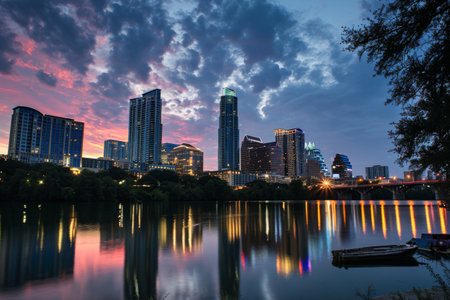 The vibrant Austin, Texas skyline glows at dusk, with modern skyscrapers and buildings illuminated against a colorful twilight sky. The city lights are beautifully reflected in the calm waters of the Colorado River, creating a mirror A bridge can be seen in the distance, adding to the urban landscape. captures the dynamic energy and beauty of the city as day transitions into night.