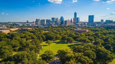 Generative AI : City skyline with exterior view of apartments flats or condos against blue sky Modern architecture views in Austin Texas against cloudless blue sky on a sunny day