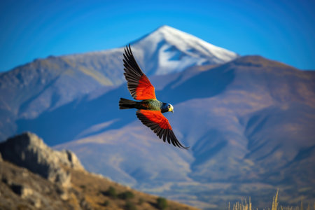 colorful bird in flight against scenic mountain backdrop, created with generative ai