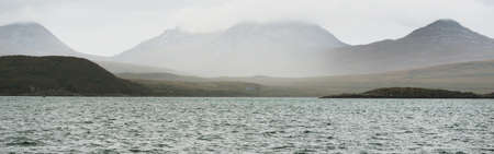 Mountains peaks under the dark storm sky. Dramatic clouds. Jura island, Inner Hebrides, Scotland, UK. Atmospheric landscape. Panoramic view