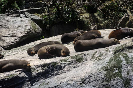 Colony of Brown fur seals basks on a large rock. Milford Sound, South Island, New Zealand