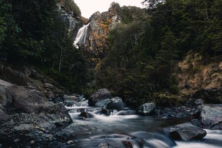 View over Mangawhero Falls rushing down from 20m height of the rocks into a small river. Magnificent peaks of Mt Ruapehu behind Mangawhero Falls, Tongariro National Park, New Zealand.