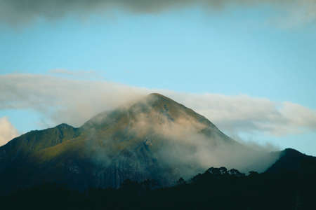 Beautiful mountainous landscape with forest covered mountain peaks and a cloudy sky