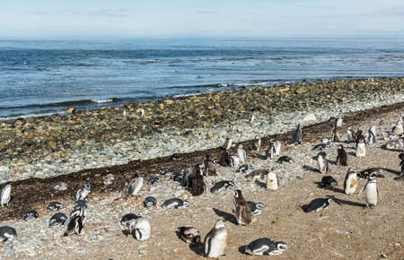 Many wild Magellanic penguins (Spheniscus Magellanicus) on a coast of Magdalena island, Chile