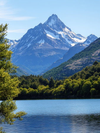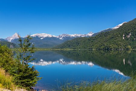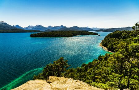 Landscape of blue lakes, Andes mountains, and forest in Patagonia, Argentina.