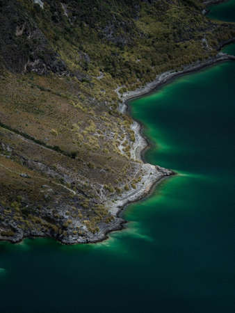 Panorama view of turquoise blue andean volcano caldera crater lake Quilotoa rim ridge loop in Pujili Cotopaxi Ecuador andes South America