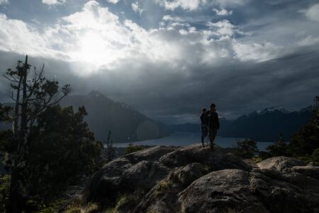 BARILOCHE / ARGENTINA - DECEMBER 27, 2017: Two hikers walk on the rocky ground on top of the mountain with spectacular views and rain drops falling in the sky