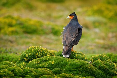 Carunculated caracara, Phalcoboenus carunculatus, beautiful bird of prey from Antisana in Ecuador. Caracara in high altitude mountain habitat, green hill vegetation. Wildlife scene from nature.