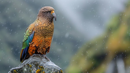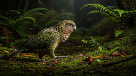 Kea in mossy forest: new zealand wildlife and habitat exploration.