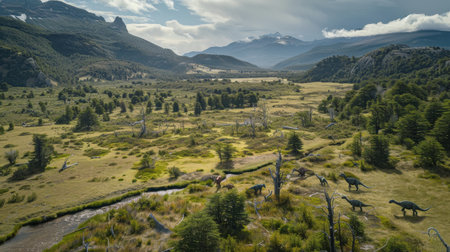 In this breathtaking view of Patagonia, a herd of massive dinosaurs traverses ancient forests, capturing the essence of the prehistoric era in a majestic landscape.