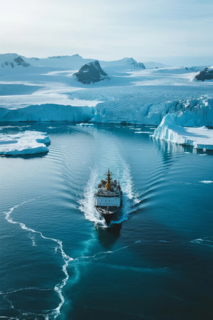 A research vessel navigates through icy waters surrounded by glaciers and icebergs in a polar region.