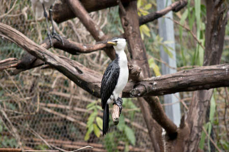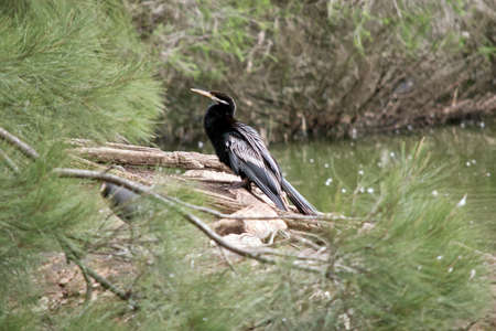 Australasian darter(Anhinga novaehollandiae) a large water bird with dark plumage and a long neck, the animal sits on a branch of a coniferous tree in a city park.