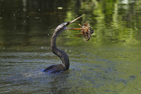 Female Anhinga bird called Anhinga anhinga and snakebird makes a nest as she prepares to lay eggs in the Corkscrew Swamp Sanctuary in Naples, Florida