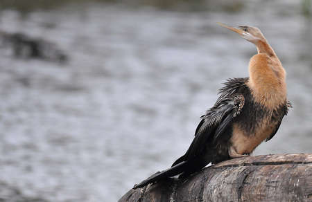 Oriental Darter or Indian snake bird (Anhinga melanogaster) perched near water body to dry the wings.