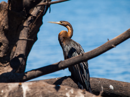 An African Darter Anhinga melanogaster drying its wings in the sun on the Chobe River in Chobe National Park in Botswana