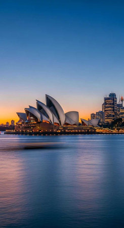 The Sydney Opera House stands majestically against a serene evening sky with calm waters reflecting vibrant colors.