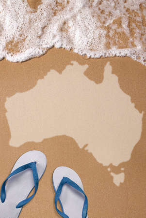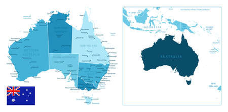 A map of Australia with an Australian flag on it. The flag is blue with white stars. Travel and government concept
