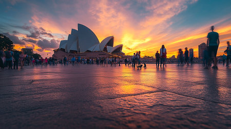 Sunset view of the Sydney Opera House with the harbor in the foreground, A sunset view of Sydney Opera House AI generated